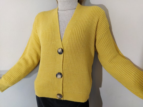 Suéter amarillo de punto, cárdigan de canalé para mujer, suéter con botones de pescador, cárdigan corto ligero, chaqueta cálida tejida a mano, prendas de punto amarillas con cuello en V Etsy