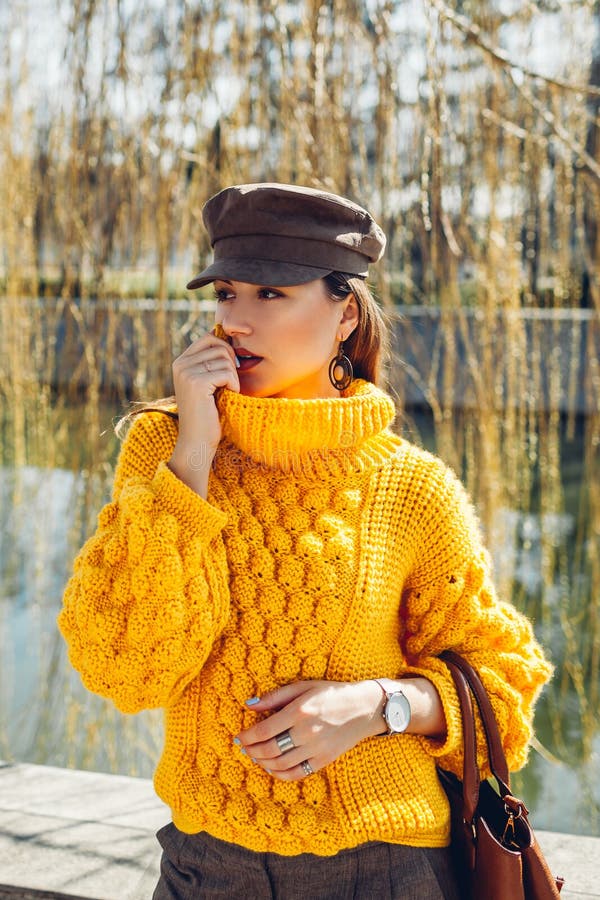 Mujer Con Un Elegante Suéter Amarillo Y Un Bolso De Mano En El Parque. Moda De Primavera. Color De 2021 Imagen de archivo Imagen de sonriente, parque: 209119533