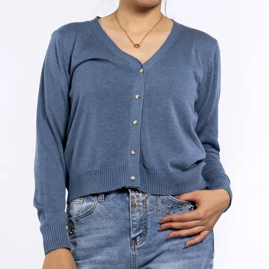 Suéter ligero de punto con cuello en V corto azul y mangas largas para mujeres