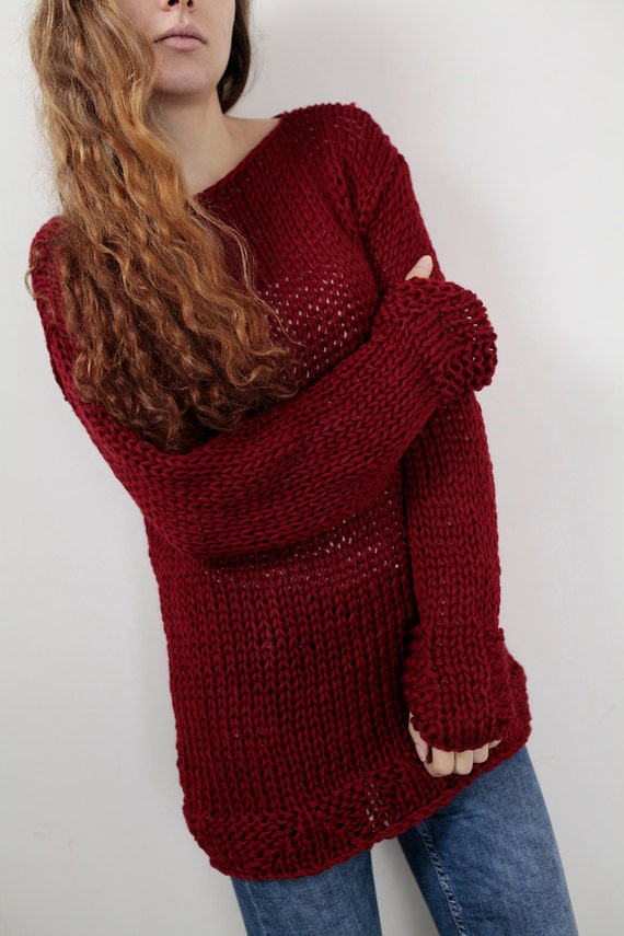 Tejido a mano mujer algodón suéter largo jersey suéter vino burdeos Etsy España